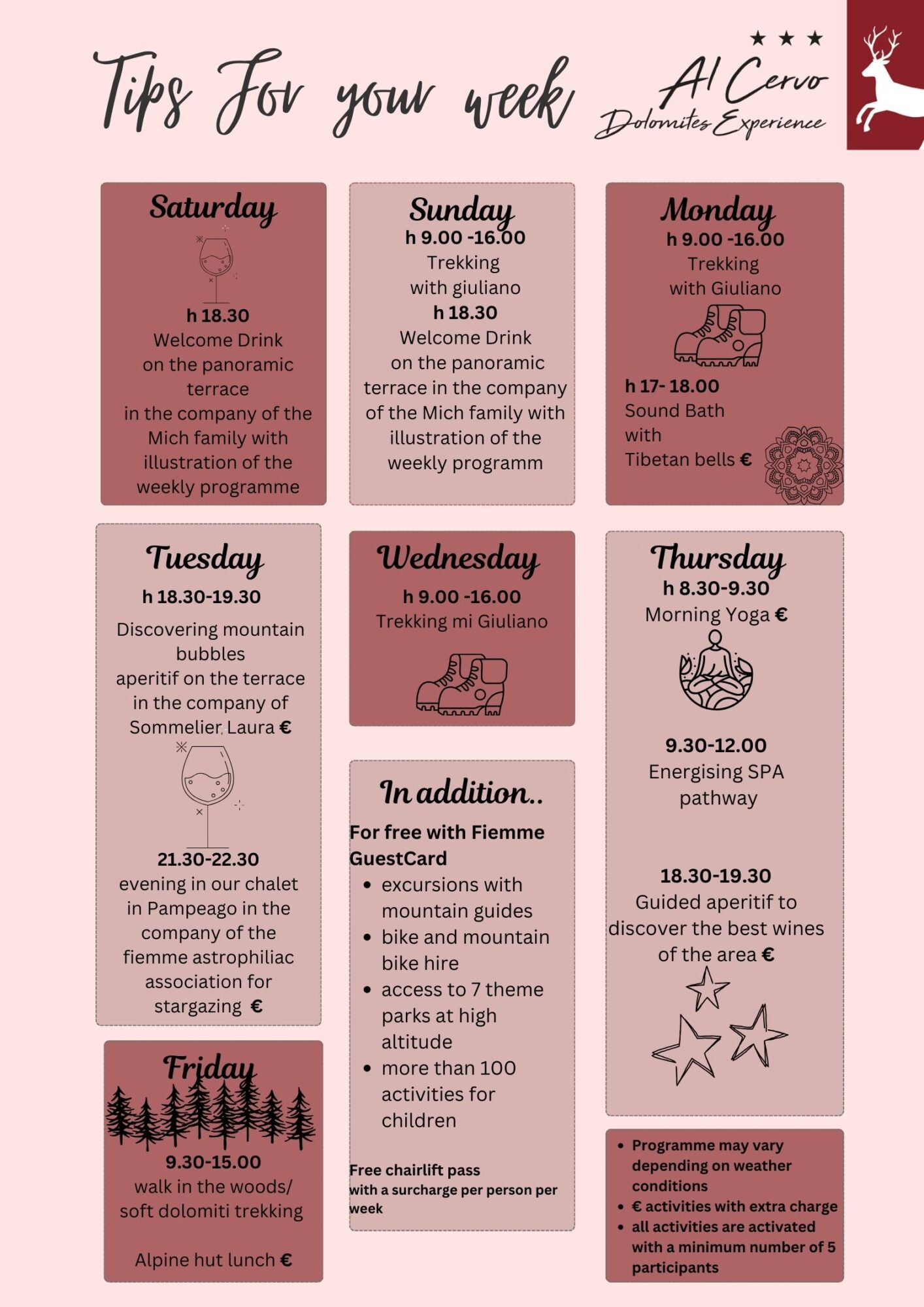 - 5 excursions to choose from with the alpine guides of Fiemme